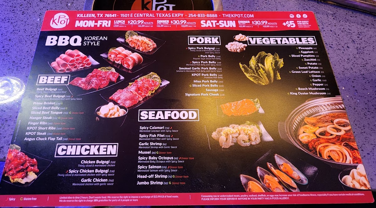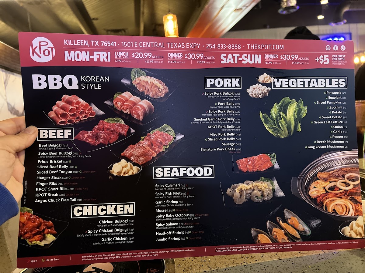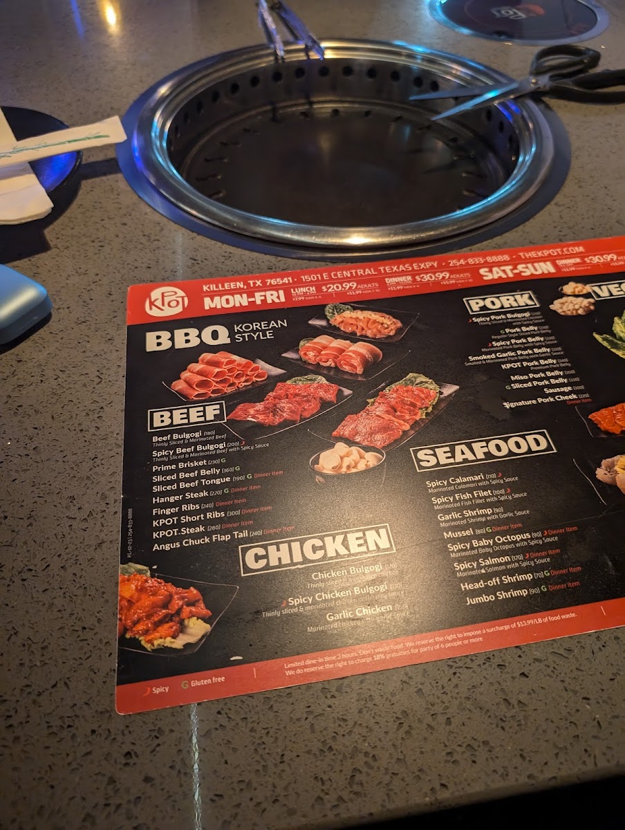 Service here enhances the flavors—attentive staff like Luis and Bessie ensure a smooth and welcoming dining experience, managing grill changes and refills seamlessly. The combination of fresh, high-quality ingredients and hands-on dining creates a vibrant atmosphere, perfect for both solo visits and group outings. KPOT’s menu successfully balances tradition and modern taste, making it a standout destination in Killeen for Korean barbecue and hot pot enthusiasts alike.